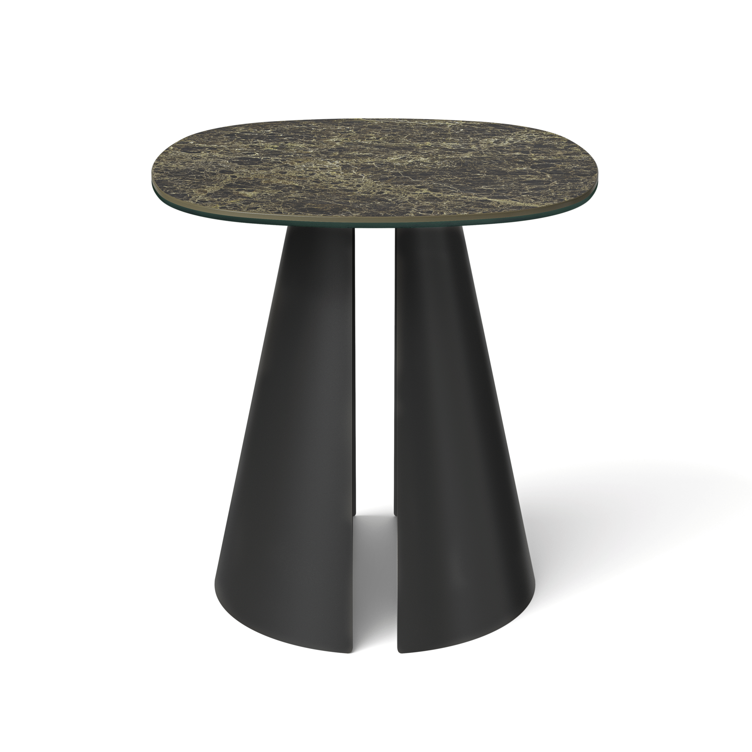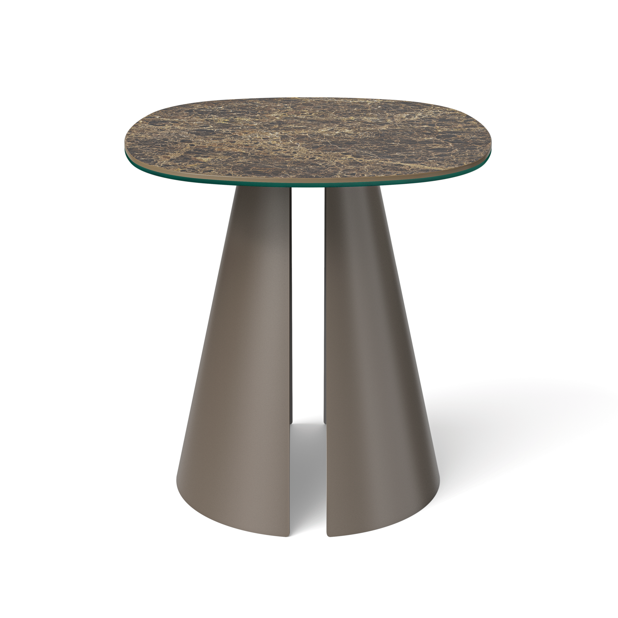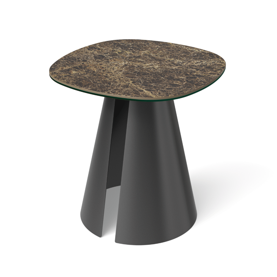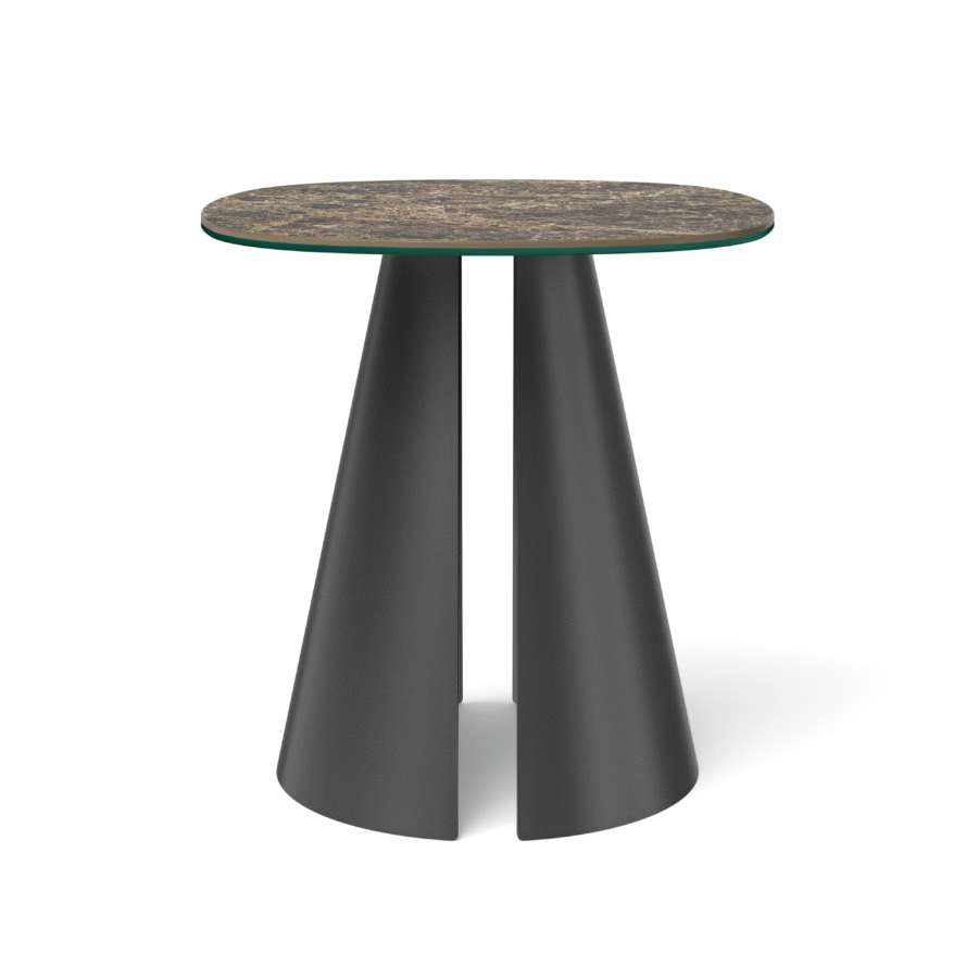 Wyraziste, stożkowe podstawy o architektonicznym charakterze zapewniają stabilność konstrukcji, a jednocześnie nadają bryle wizualnej lekkości. Ich proporcje subtelnie eksponują kształt blatu, budując harmonijną i nowoczesną kompozycję.